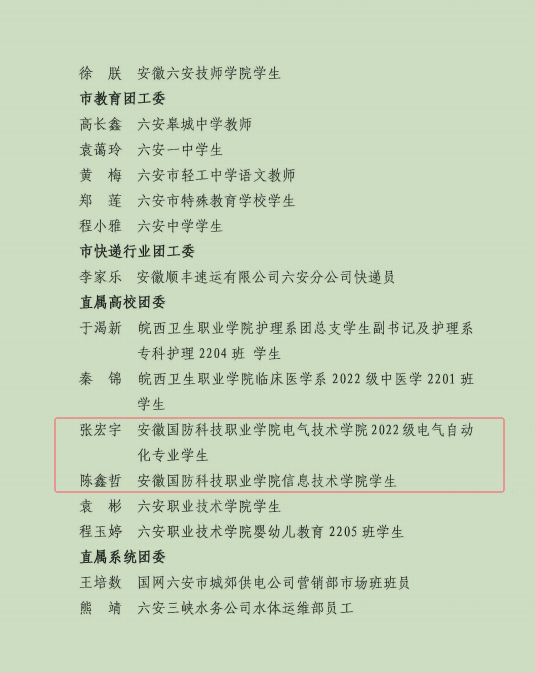 电气技术学院张宏宇同学、信息技术学院陈鑫哲同学获“六安市优秀共青团员”荣誉称号