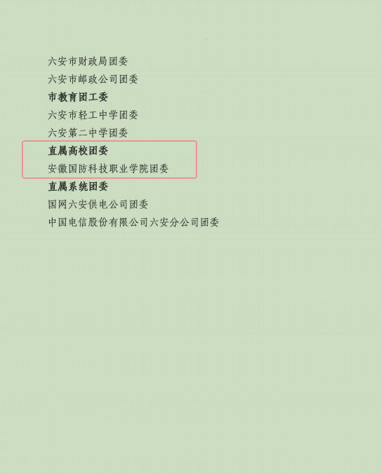 学校团委获“六安市五四红旗团委”荣誉称号;汽车技术学院团总支获“六安市五四红旗团总支部”荣誉称号;电气技术学院张宏宇同学、信息技术学院陈鑫哲同学获“六安市优秀共青团员”荣誉称号;电气技术学院团总支书记陈俊获“六安市共青团干部”荣誉称号。
