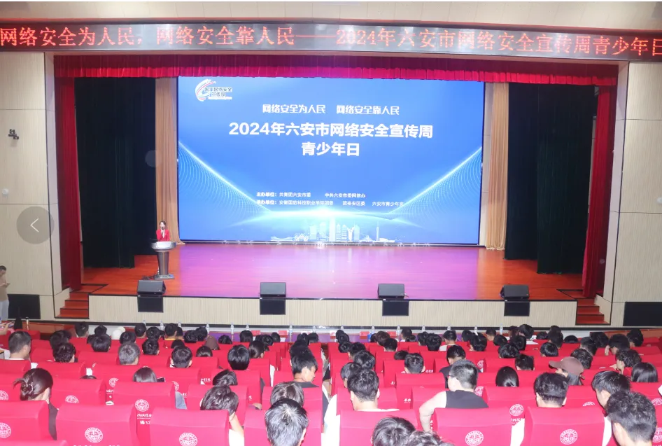 本网讯 9月14日,由共青团六安市委与市委网信办主办,beat365在线唯一官网团委、共青团裕安区委员会及六安市青少年宫共同承办的2024年六安市网络安全宣传周“青少年日”主题活动,在beat365产教融合中心的多功能报告厅顺利举行。团市委书记罗伟伟,团市委副书记苏原,校党委委员、宣传部长陈思,校网络信息中心主任王志宏,市委网信办网络安全科科长李刚以及市青年宣讲员、青年大学生代表等400余人参加。