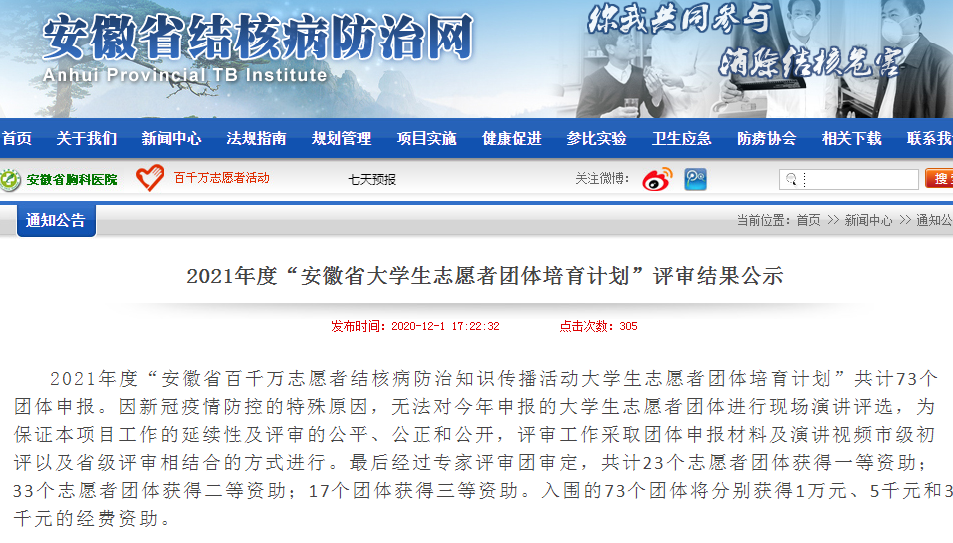 此次由安徽省结核病防治研究所主办的2021年度“安徽省百千万志愿者结核病防治知识传播活动大学生志愿者团体培育计划”共计73个团体申报,团体申报材料及演讲视频市级初评以及省级评审相结合的方式进行。最后经过专家评审团审定,beat365青年志愿者协会获得团体三等资助,为beat365开展预防肺结核疾病相关活动提供了支持。