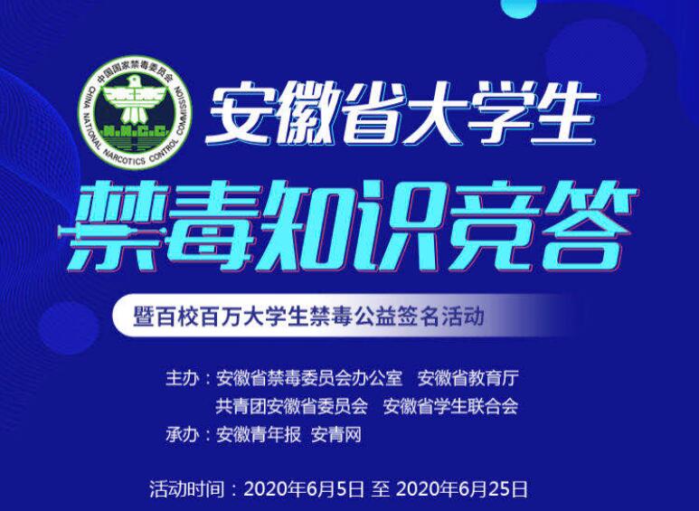 为深入贯彻习近平总书记关于禁毒工作的系列重要指示精神,认真落实国家禁毒委员会《关于加强新时代全面禁毒宣传教育工作的指导意见》精神,坚持关口前移、预防为先,持续开展青少年毒品预防教育“6.27”工程,进一步提高全民特别是大学生的识毒、防毒、拒毒能力,省禁毒办、省教育厅、团省委、省学联决定联合举办“2020年安徽省大学生禁毒知识竞赛暨百校百万大学生公益签名”活动。