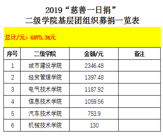 根据《关于开展beat365大学生“慈善一日捐”活动的通知》(校团〔2019〕45号)文件精神,各院团总支和各班级团支部积极配合下开展“慈善一日捐”活动。共募捐到金额为6875.34元,现将各院团总支和各班级团支部募捐情况公示如下(具体募捐明细见附件):