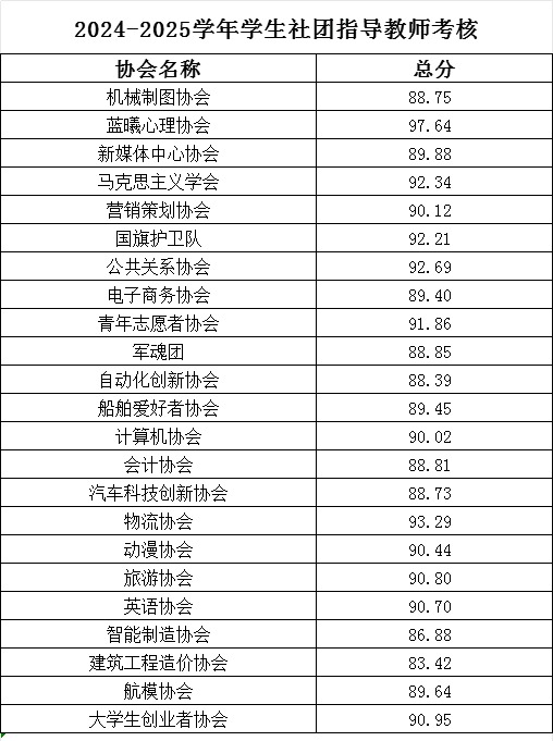 2024-2025学年学生社团教师考核已结束,现将评审结果予以公示。对公示有异议的,可以向校团委反映,公示时间2025年6月30日至2025年7月4日。