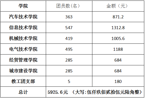 根据《中国共产主义青年团章程》及《共青团中央关于印发<关于中国共产主义青年团团费收缴、使用和管理的规定>的通知》要求,学校团委于2025年11月开展2025-2026学年团费收缴工作,现将团费收缴情况公示如下: