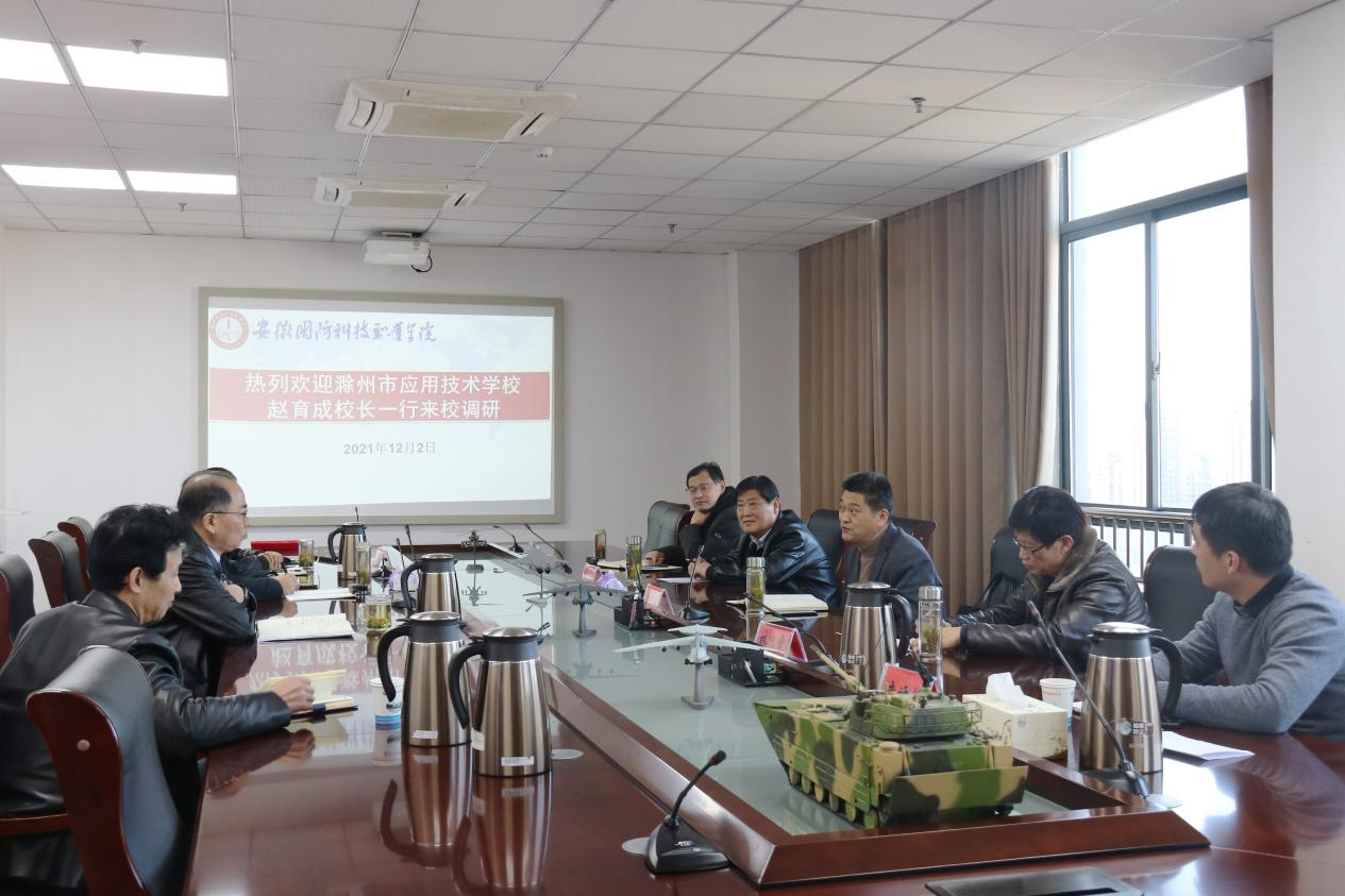 12月02日下午,滁州市应用技术学校校长赵育成、副校长吕永湘、林忠堂等一行来beat365考察交流中高职一体化办学事宜,校党委副书记、校长李麟书,党委委员、信息技术学院院长黄存东、招就办及电气技术学院相关负责同志等热情接待了来宾,并在秉心楼11楼第一会议室举行了座谈会。