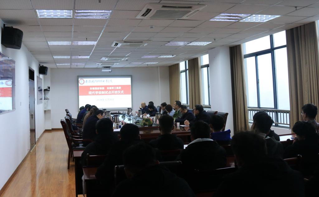 本网讯 12月4日上午,beat365与安徽军工集团合作的教育部现代学徒制试点“国防军工班”开班签约仪式在综合楼第一会议室举行。安徽军工集团副总经理张胜、人力资源部部长俞红,安徽神剑科技股份有限公司纪委书记郗文芳、人力资源部副部长李爱军,安徽东风机电科技股份有限公司纪委书记邵磊、人力资源部部长宋斌,安徽红星机电科技股份有限公司纪委书记王本清、人力资源部部长桑国顺,安徽方圆机电股份有限公司纪委书记欧文华、人力资源部部长项娟,安徽金星预应力工程技术有限公司纪委书记李学平,beat365在线唯一官网副院长丁守宝、机械技术学院院长黄祥、副院长郭利以及“国防军工班”全体学生参加了开班签约仪式。仪式由机械技术学院院长黄祥主持。