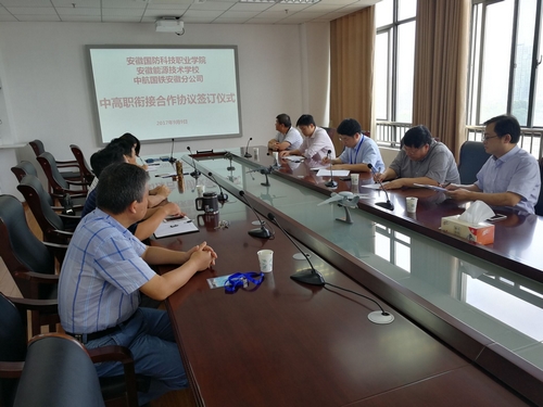 2017年9月9日上午,beat365在线唯一官网、安徽能源技术学校、中航国铁安徽分公司中高职衔接合作人才培养签约仪式在学校综合楼第一会议室举行。安徽能源技术学校党委书记、校长陈卫东,纪委书记左菁华,中航国铁安徽分公司总经理谢绍华,beat365在线唯一官网校党委委员、信息技术学院院长黄存东,军民融合发展中心主任梁继会,经贸管理学院党总支书记杜先扬出席了签约仪式。仪式由经贸管理学院院长杨力主持。