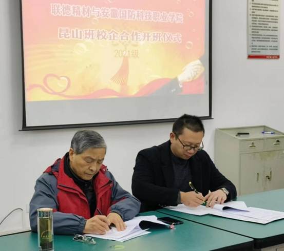 随后,举行了2021级昆山联德订单班开班仪式。首先由夏世林介绍了订单班的合作内容,致力于为所有学生提供广阔平台和最优质的企业培养资源,让学生在学校就能感受实际工作场景。其次,熊良平提出在本届订单班教学管理环节中,校企还将为订单班设置一系列定制化培训,帮助学生适应企业文化,塑造职业心态。他希望,本届订单班能成为进一步全面深化双方合作,达成发展战略共识的契机。最后,由校企双方订单班负责人在校企合作订单班协议书上完成了签字仪式。