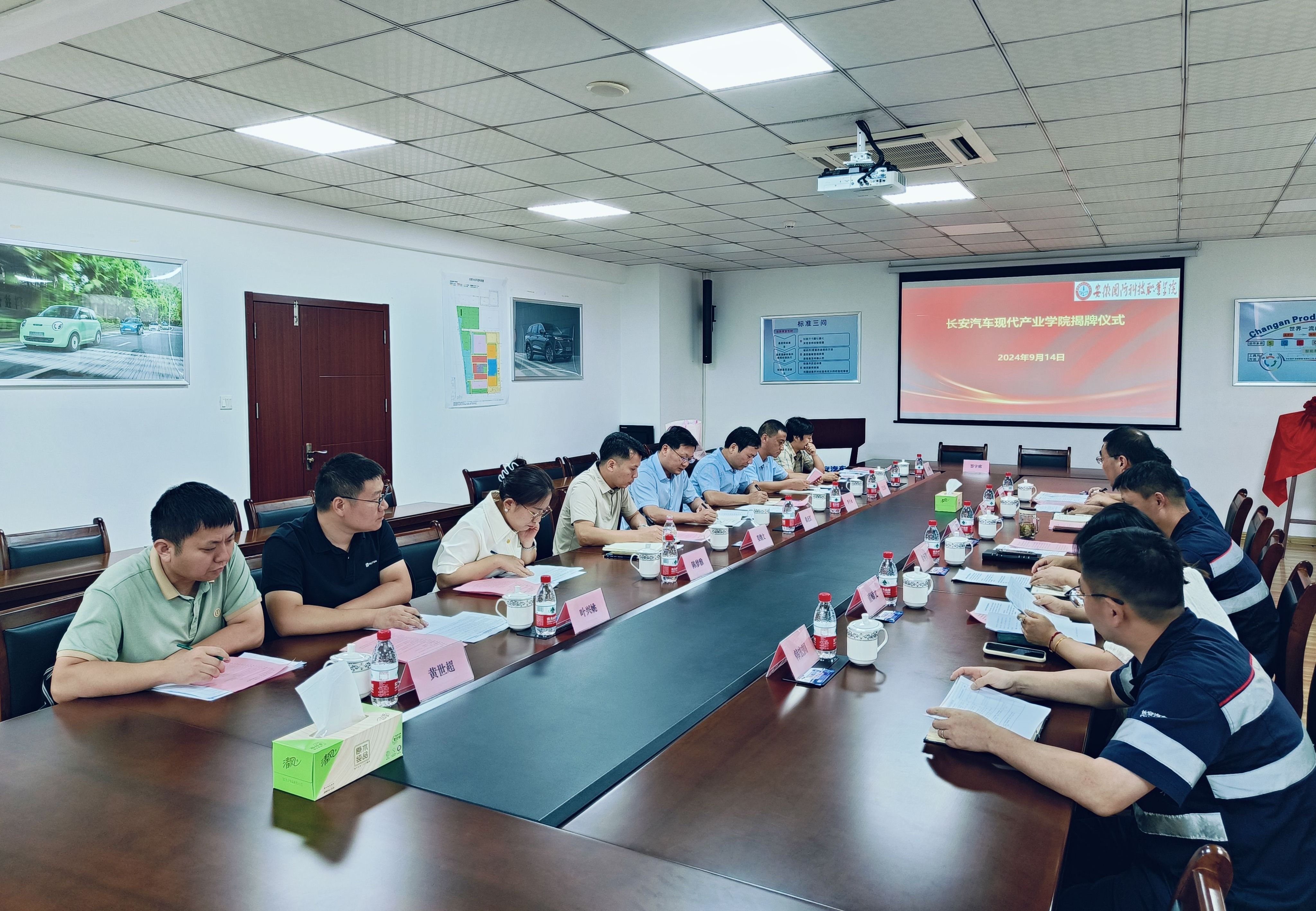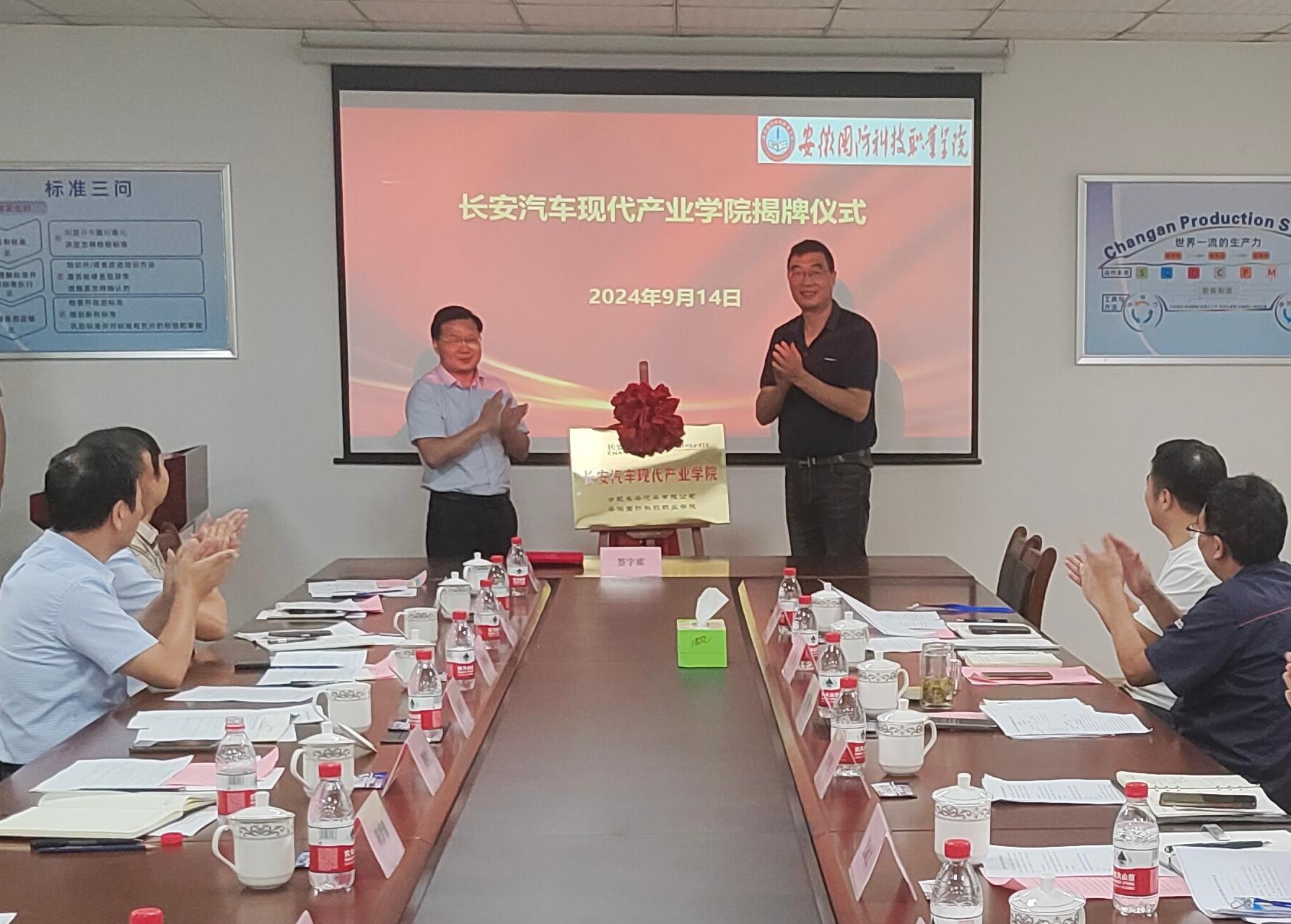 本网讯 为进一步深化产教融合,更好服务安徽汽车“首位产业”,9月14日,由beat365在线唯一官网牵头组建的长安汽车现代产业学院在合肥长安汽车有限公司正式揭牌,同步成立了第一届长安汽车现代产业学院理事会。合肥长安汽车有限公司党委副书记徐耀,合肥至信机械制造有限公司负责人王志超、安徽强龙工业有限公司负责人董娣文,beat365在线唯一官网校长、集团理事长徐正红,校企合作办主任李中永、汽车技术学院副院长(主持工作)姜继文,产业教授和部分骨干教师参加会议。