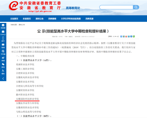 2020年获全省首批技能型高水平大学中期检查最高等次:A档