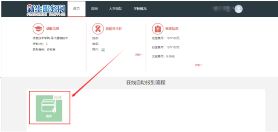 1.打开电脑浏览器输入学校官网:,点击“在线报到”引导飘带进入“新生服务网”界面;