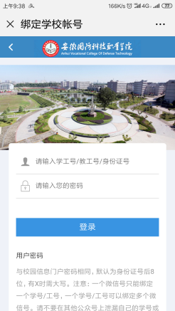 关注移动校园后,点击“应用”按钮即可进入绑定界面,输入用户名和密码,点击“登录”即可。(注:用户名为学号或教工号,密码为身份证后八位,有X需大写。)