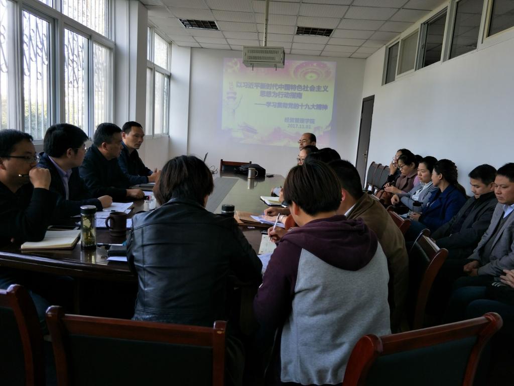 本网讯(经贸管理学院 许凤麟)11月1日下午,经贸管理学院在院会议室召开了全体教职工政治学习会议,学习贯彻党的十九大精神。会议由党总支书记杜先扬主持。