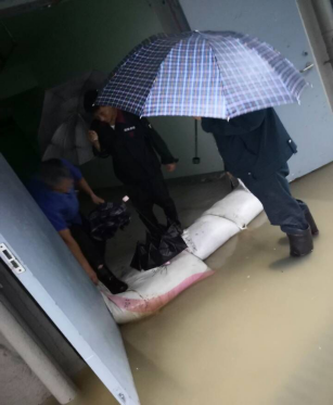 图为:后勤服务中心、物业人员在防汛抗洪抢险