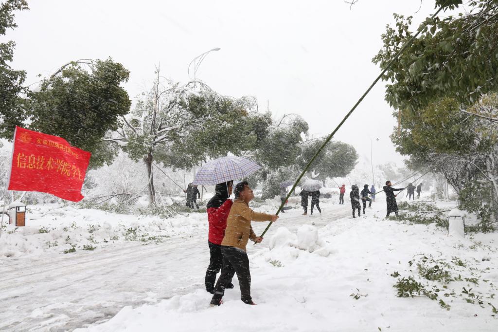 各二级学院学生也自发组织了义务除雪活动,虽然天气寒冷,大雪纷飞,但同学们个个忙得热火朝天。