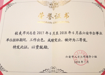 张爽华老师在安徽省六安恒源机械有限公司挂职期间,被聘为企业总工,在工作中兢兢业业,不断创新,将理论与实践结合进一步发挥科学研究的优势,精准培训企业专业技术人员,参与企业技术研发,在挂职期间取得一定的科研成果,提高了企业发展竞争力。张爽华老师还积极推进产学研合作,为企业与高校牵线搭桥,在挂职锻炼期间,受到省委教育工委、六安市委及挂职企业的一致好评和充分肯定,并在2016年6月至2017年6月挂职期间,荣获六安市人才工作领导小组颁发的三等奖荣誉证书。