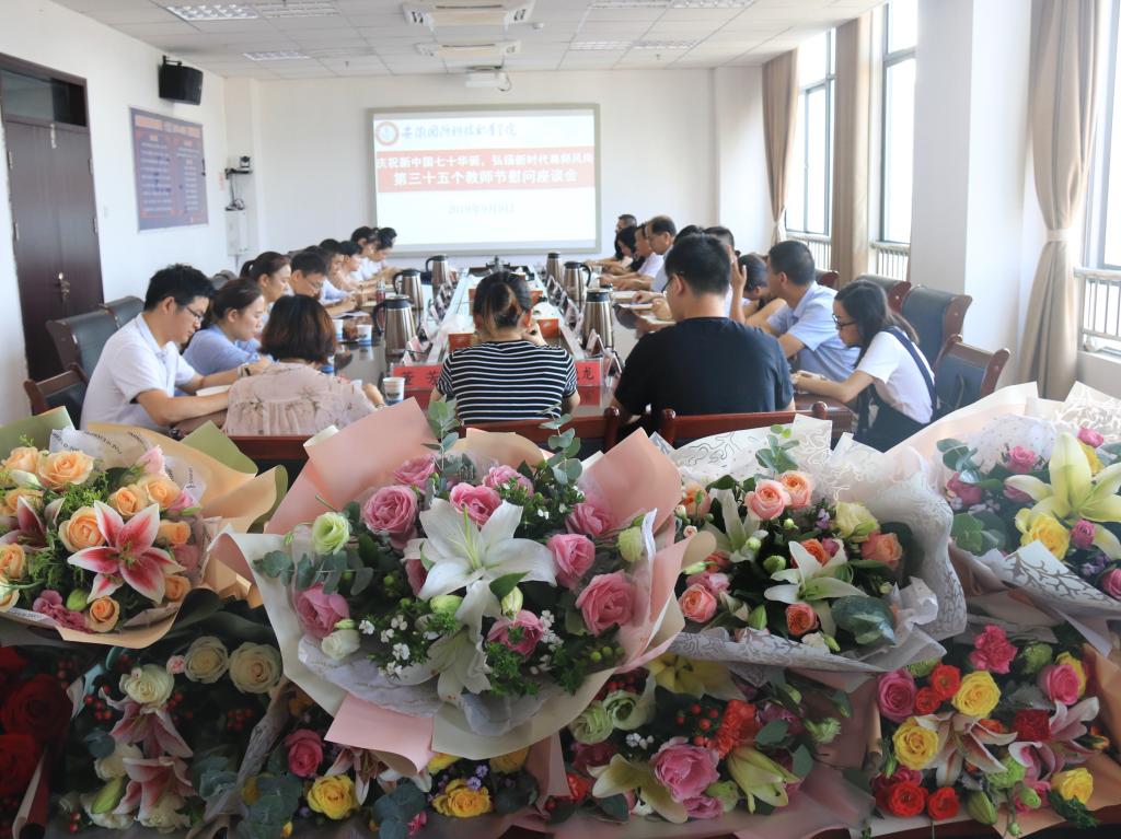 金菊溢彩,丹桂飘香。在第三十五个教师节和中午佳节来临之际,9月9日下午,学校在秉心楼第一会议室召开了以“庆祝新中国七十华诞,弘扬新时代尊师风尚”为主题的教师节慰问座谈会。校长李麟书、党委副书记朱德明、副校长丁守宝、组织人事处处长付贤政及教职工代表参加了座谈。会议由副校长丁守宝主持。