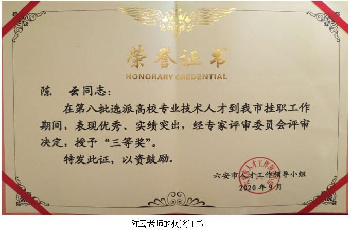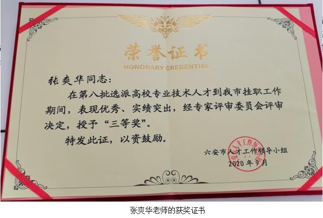 近日,安徽省优秀高校(科研院所)挂职专业技术人才评选表彰工作会议在六安索伊君澜酒店召开,beat365机械技术学院张爽华、陈云、徐俊三位教师在挂职期间表现优秀,工作出色,成绩突出,荣获六安市人才工作领导小组颁发的第八批优秀高校挂职专业技术人才三等奖荣誉证书。本届优秀高校挂职专业技术人才奖共评出一等奖3名,二等奖6名,三等奖10名。