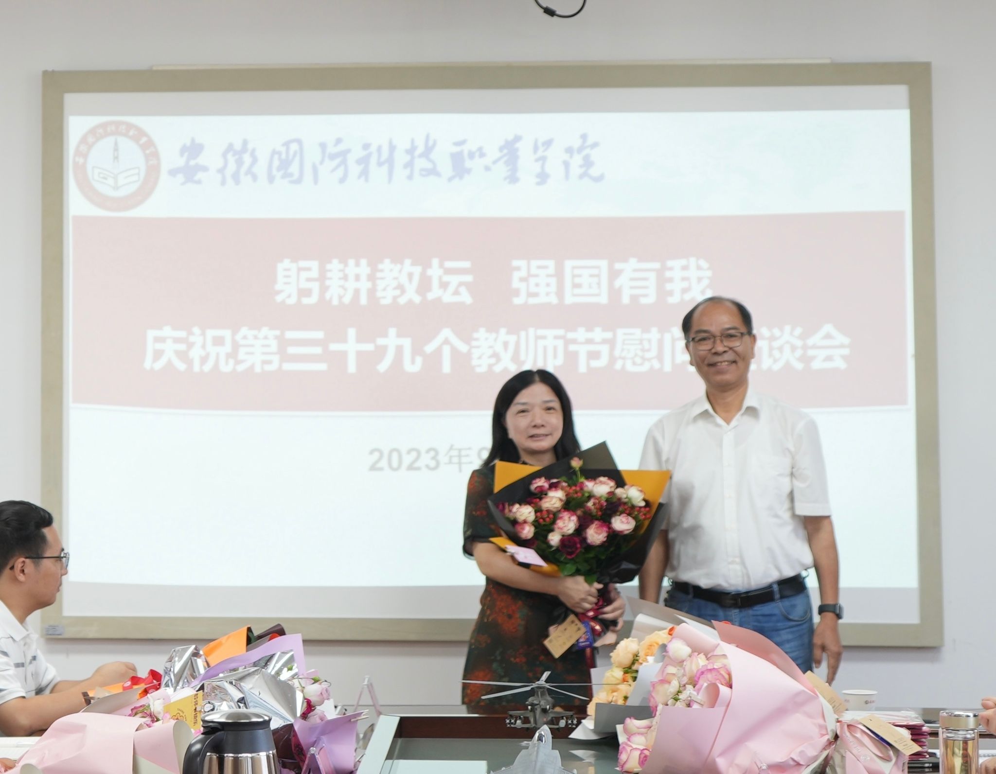 党委书记余嗣元、校长李麟书代表学校向优秀教职工代表送上慰问的鲜花,向全体教职工致以节日的问候和诚挚的祝福,向为学校建设发展做出重大贡献的退休老教师致以崇高的敬意,向辛勤耕耘在教学、科研、管理、服务工作一线教职工们表示衷心的感谢!