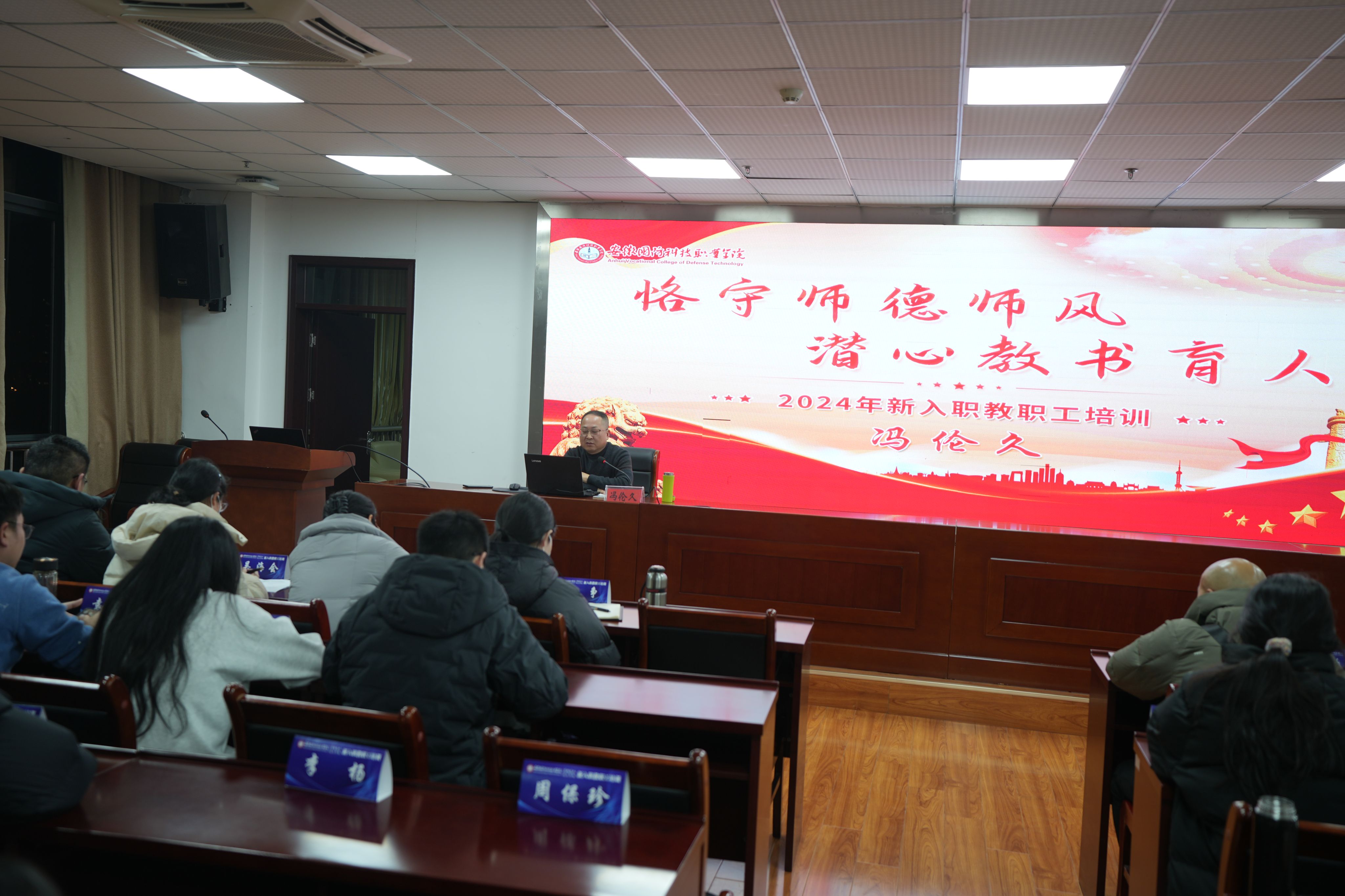 校党委副书记冯伦久以“恪守师德师风,潜心教书育人”为主题作高校师德师风主题讲座。他从“牢记习近平总书记教导,做党和人民满意的好老师”、“高校师德师风建设形势”、“自觉遵守《新时代高校教师职业行为十项准则》”、“严格落实学校《教师师德失范行为处理实施细则》”四个方面结合具体现实案例展开阐述,并提出要求。他强调各位新进职工要不断提高教学水平,提升职业道德修养,严守师德师风底线,大力弘扬教育家精神,争做“四有”好老师。