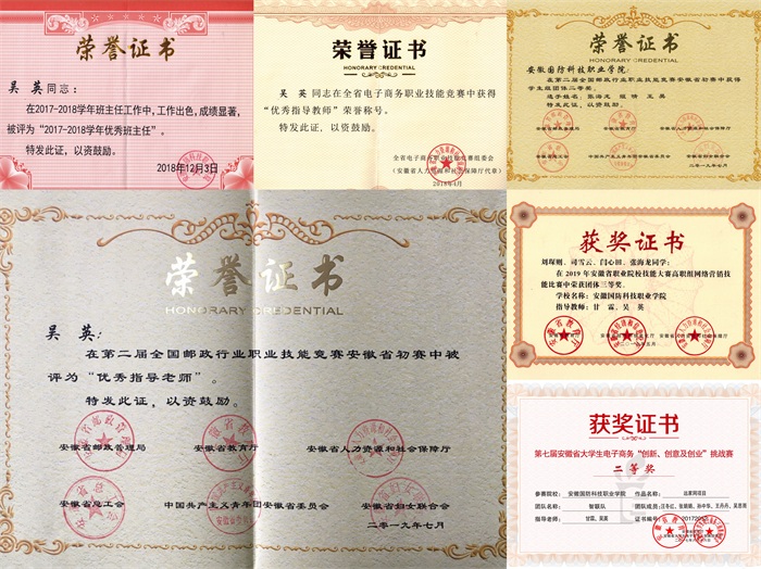 吴老师在校期间主要承担《电子商务数据分析》、《网店运营推广》、《仓储与配送实务》、《办公软件高级应用》等课程的教学,并完成了大量的学生实习、实训、论文指导等工作。主持省教育厅人文社科研究项目重点项目1项,省级质量工程项目1项,校级课题2项,参与省级课题8项,公开发表学术论文多篇。积极开展学生课外技能竞赛指导,指导学生参加各级专业技能竞赛获得省级一等奖1项,省级二等奖2项,省级三等奖1项,两次被评为“优秀指导老师”。